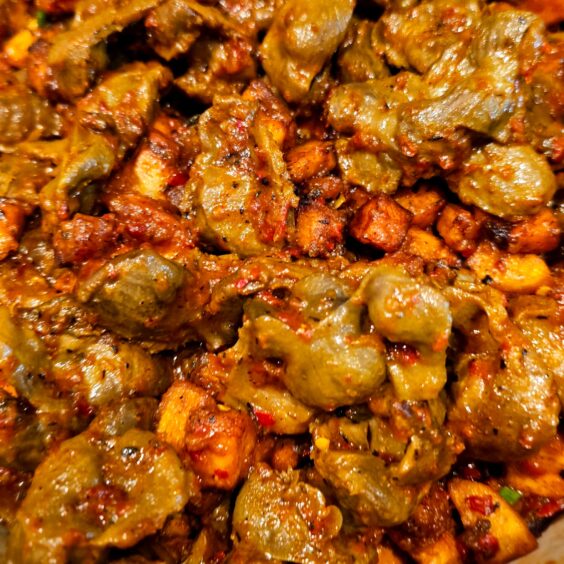 This is a delicious mix of fried ripe plantain and sauteed gizzards cooked in our designer pepper sauce gizdodo. This is usually sweet, savory, and spicy, often paired with rice dishes or enjoyed alone.